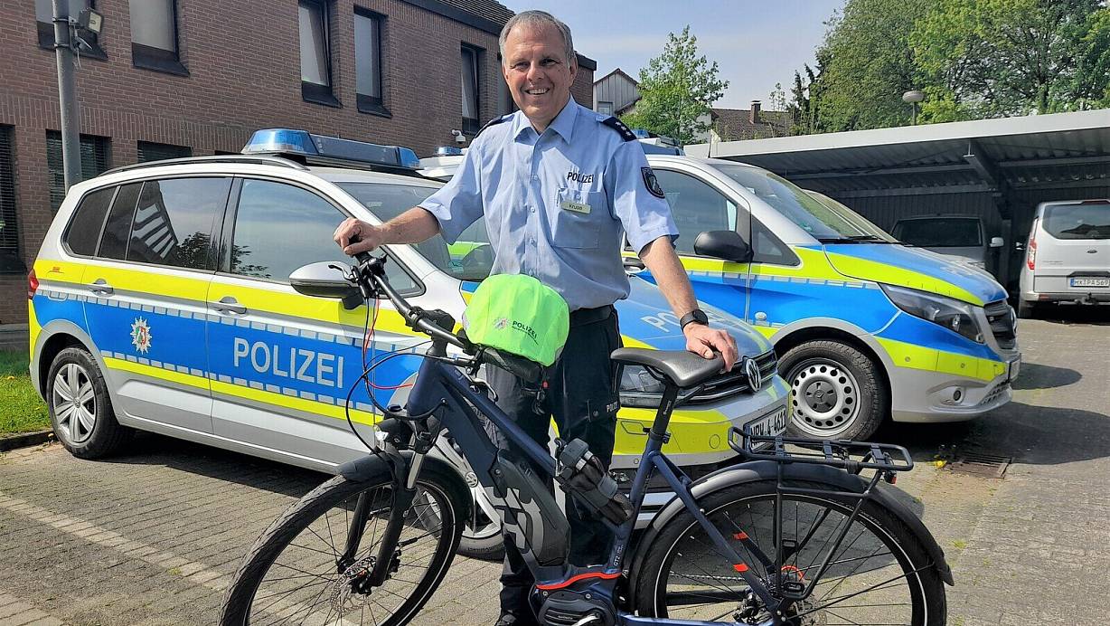 Thomas Kruse, Polizeihauptkommissar und Verkehrsicherheitsberater/Opferschutz, mit einem E-Bike vor der Wache in Bad Driburg. | © Simone Flörke