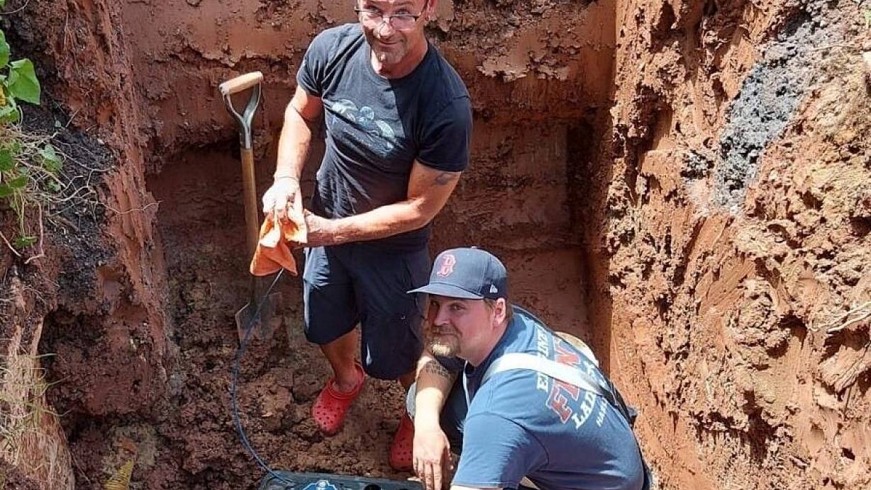 Das Tier steckte in einem Abflussrohr fest. Die Rettungskräfte rückten unter anderem mit einem Bagger an. Dabei blieben die Hilfsmaßnahmen zunächst ohne Erfolg.