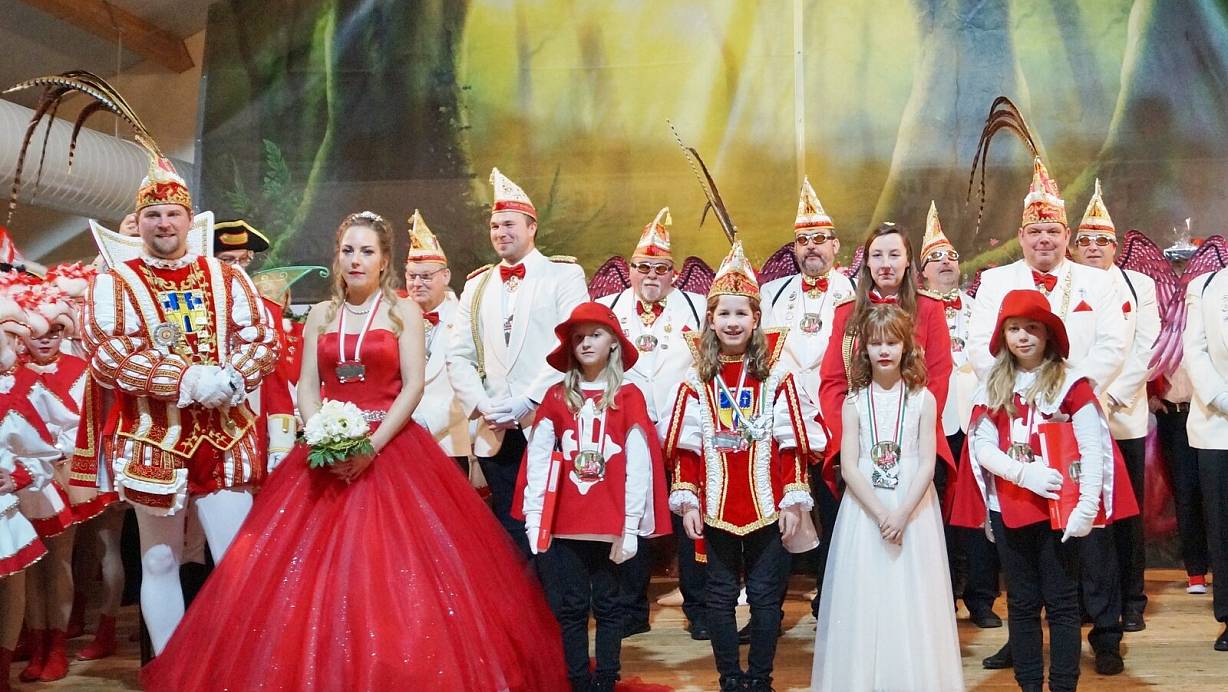 Endlich wieder Kinderkarneval: Auf dem großen Krönungsball für die kleinsten Jecken wurden Prinz Felix I. und Prinzessin Zoé I., mit ihren Paginnen Leonie Kraft und Fiona Siegert und dem Prinzenpaar der KG Rot-Weiße Garde Bernhard I. und Katharina I., offiziell proklamiert. | © Silke Riethmüller