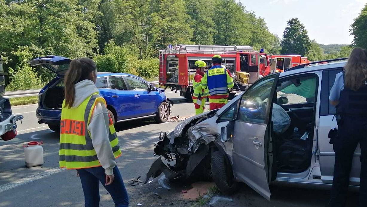 Ein 53-Jähriger gerät in den Gegenverkehr und kracht mit zwei weiteren Fahrzeugen zusammen. Fünf Personen werden verletzt, eine davon schwer. Die B64 zwischen Herste und Bad Driburg war bis 14 Uhr komplett gesperrt.