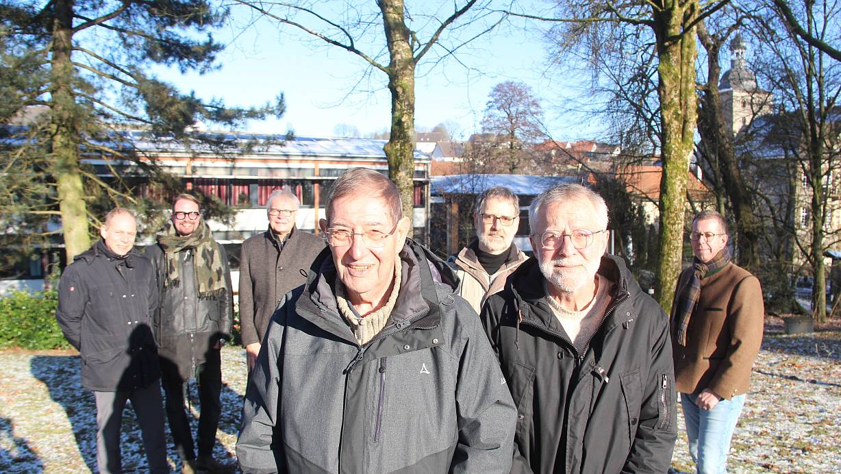 Der Stiftungsvorstand mit Sebastian Otten (v. l.), Patrick Kleibold, Burkhard Nickel, Pater Josef Klingele (vorn), Schulleiter Matthias Nadenau, Pater Thomas Wunram und Marcus Weiß. | © Burkhard Battran