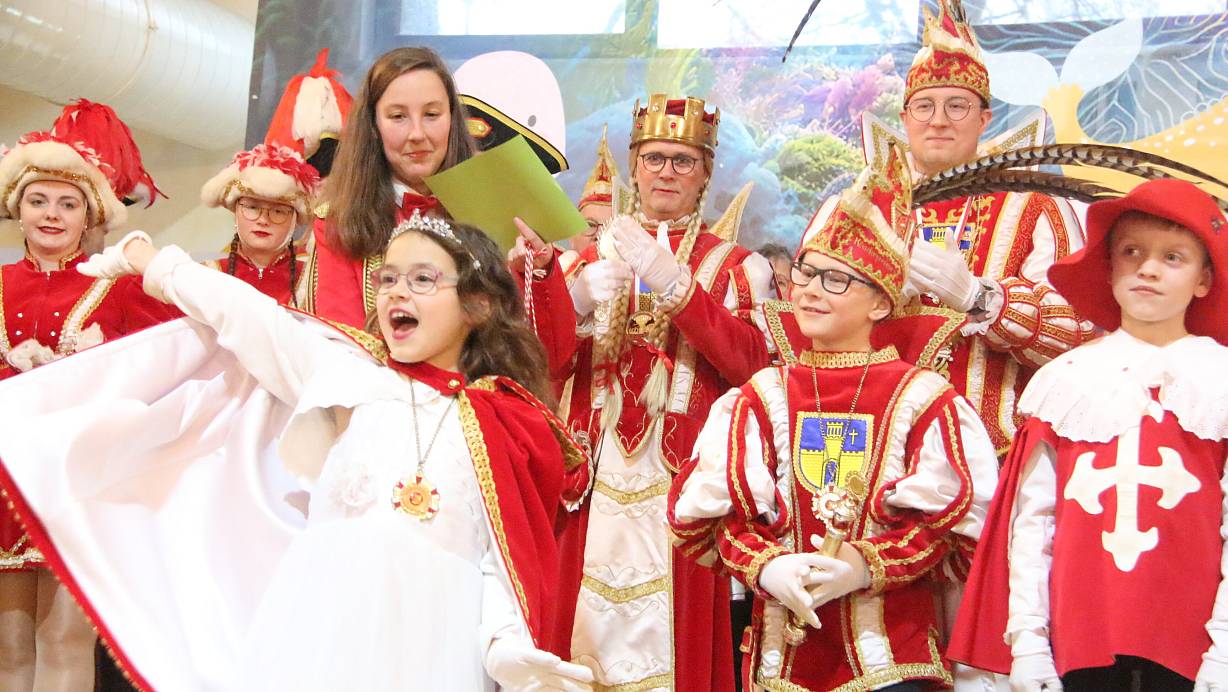 Das amtierende Kinderprinzenpaar Elina Mohammadi und Erwin Willmann (beide 8 Jahre) begrüßten rund 300 große und kleine Närrinnen und Narren. Viele waren bereits am Vormittag beim närrischen Gottesdienst dabei. Aber jetzt konnte richtig aufgedreht werden. Die Kinderprinzenehrengarde zeigte ihr Können beim Showtanz. Auch das Dreigestirn und der Präsident machten den jungen Karnevalisten ihre Aufwartung.