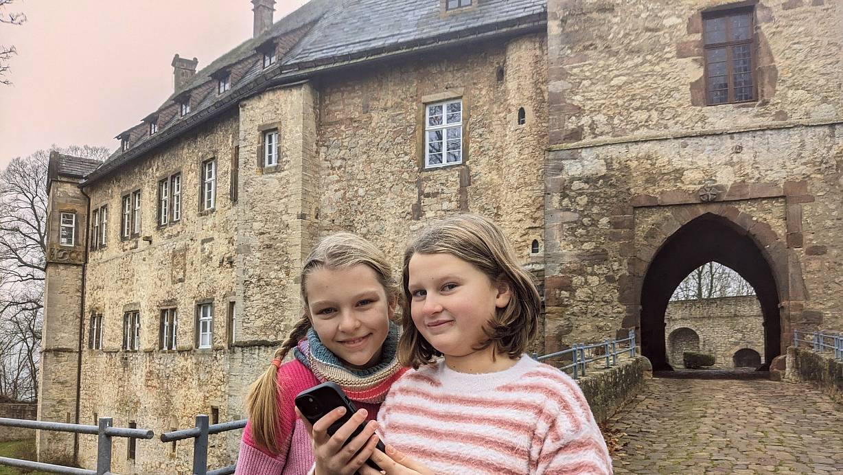 Die Spieletesterinnen Lena Rehermann und Lotta Gaidzik sind von der App, die sie rund um die Burg in Bad Driburg-Dringenberg führt, begeistert. | © Burkhard Battran