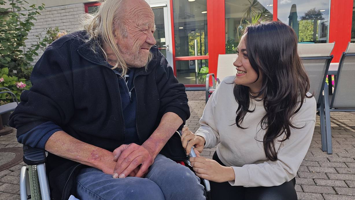 Bewohner Reinhard-Ludwig Schäfer im Gespräch mit Fatemeh Tavanaye-Manafi, die vor rund einem halben Jahr ihre Ausbildung als Pflegefachkraft im Philipp-Melanchthon-Zentrum in Bad Driburg begonnen hat. | © Svenja Ludwig