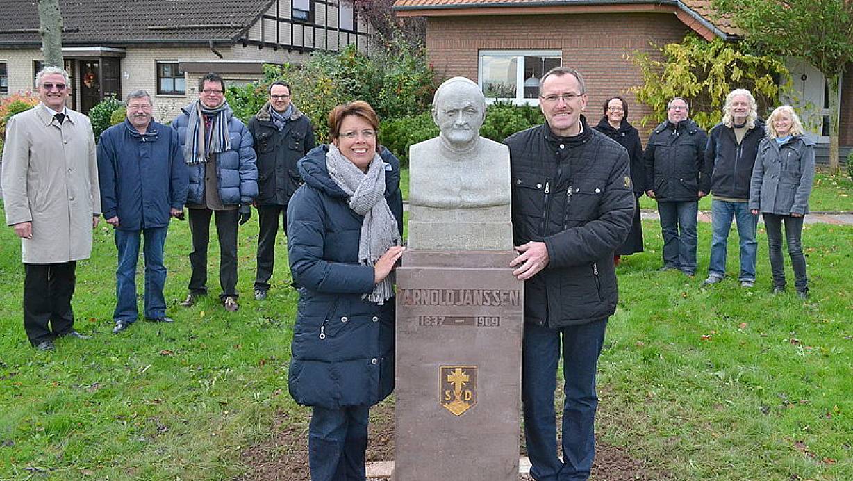 Neben dem Pastoralverbundsleiter, Baudezernent Markus Baier und den Stiftern der Büste, Ingrid und Christian Holdgrewe, waren auch Pfarrer Kurt Tielker als Vertreter der evangelischen Kirchengemeinde, die Ratsfrauen Marianne Strauß und Petra Flemming-Schmidt, stellvertretender Bürgermeister und Bauausschuss-Vorsitzender Horst Verhoeven sowie Wolfgang Tewes vom Hochbauamt dabei, als Restaurator Axel Kebernik die Büste Arnold Janssens offiziell an die Stadt übergab.