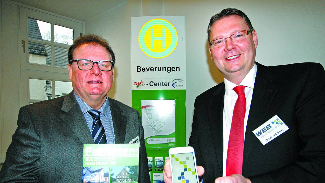 Mit App und Fahrplan: Dieter Pollmann (l.) und Bernhard Risse, Geschäftsführer der Weser-Egge-Bus GmbH. FOTO: SIMONE FLÖRKE | © Simone Flörke