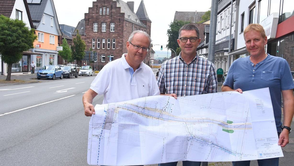 Im Bereich der Burgstraße sind beidseitig Schmutz- und Regenwasserkanäle vorhanden, die in den Gehwegen/Parkbuchten oder teilweise im seitlichen Fahrbahnbereich verlaufen. „Bei den Regenwasserkanälen handelt es sich um alte Betonrohr-Mischwasserkanäle, die sich einschließlich der Anschlussleitungen in einem schlechten baulichen Zustand befinden", sagt Bürgermeister Hubertus Grimm bei der Vorstellung der Pläne. „Diese Leitungen werden ebenso erneuert wie auch alte Strom- und Wasserleitungen. Diese sind zum Teil älter als 70 Jahre. Aufgrund wasserrechtlicher Anforderungen hat das Abwasserwerk eine Regenwasserbehandlungsanlage zu bauen, da das Straßenabwasser der B 241 vor Einleitung in die Weser gereinigt werden muss.