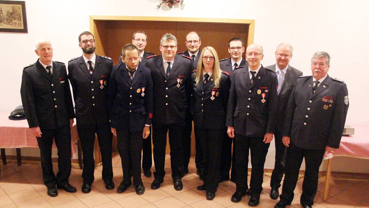 Kreisbrandmeister Rudolf Lüke (l.) mit den geehrten Feuerwehrleuten sowie Ehrenbrandmeister Hubertus Nostitz, (v. r.) Bürgermeister Hubertus Grimm und dem stellvertretenden Wehrführer Sebastian Ewen (4. v. r.). | © Burkhard Battran