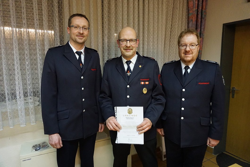 Ausgehend vom alljährlichen Leistungsnachweis konnte Jannis Göke das Feuerwehrleistungsabzeichen in Bronze in Empfang nehmen. Mark Rode erhielt das Leistungsabzeichen in Silber, Johannes Schlüter und Michael Schrick in Gold. Die Sonderstufe Gold auf blauem Grund für die zehnmalige Teilnahme am Leistungsnachweis erhielten Julian Gogrewe und Lukas Giefers. Für 15-malige Teilnahme erhielt Ulrich Knipping das Leistungsabzeichen in Gold auf rotem Grund.