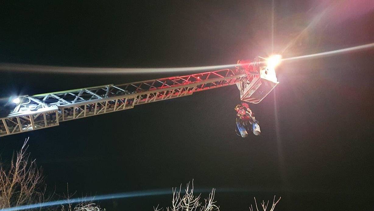 Diese seilten sich im weiteren Verlauf über die Beverunger Drehleiter, welche zwischenzeitlich oberhalb des Felsvorsprunges auf dem darüber verlaufenden Wirtschaftsweges in Stellung gebracht wurde, über eine Strecke von rund 20 Meter nach unten ab. Die Höhenretter sicherten den Hund und konnten diesen nach wenigen Minuten sicher nach oben retten und an die Besitzerin übergeben.