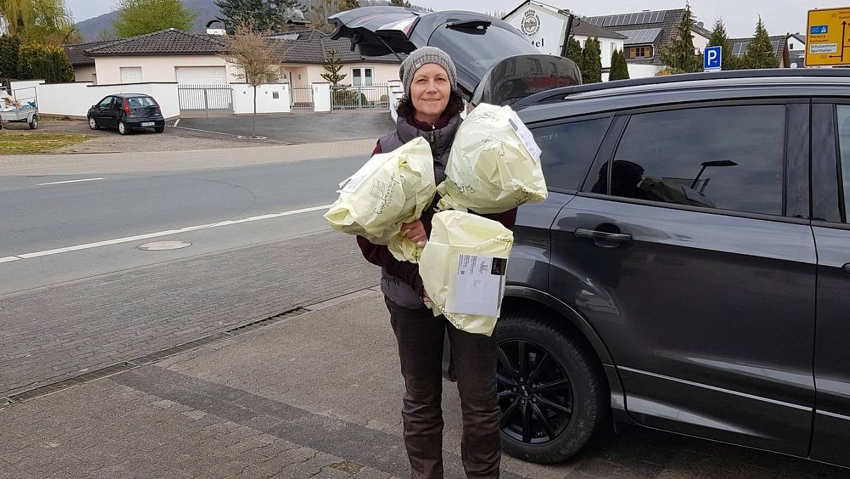 Bringt Blumen und Freude ins Haus: Kathrin Frischemeyer mit einer Autoladung Sträuße, die sie ausliefert - bis vor die Haustür, nicht weiter. | © Privat
