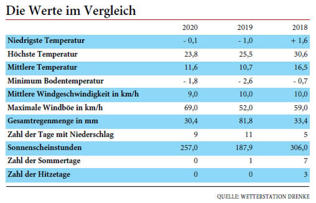 Hatte die Maximaltemperatur nämlich am 10. Mai noch bei 18 Grad gelegen, betrug sie einen Tag später nur noch 11,3 Grad. Im Folgenden gab es bis zum 16. Mai in Drenke auf dem Berg noch dreimal Bodenfrost bis minus 1,8 Grad. Und erst dann bewegte die Temperatur sich wieder in Richtung der Plus-20-Grad-Marke. „Beleg dafür, dass einige der oftmals belächelten Bauernregeln, welche die Erfahrungswerte unserer Vorfahren widerspiegeln, auch im 21. Jahrhundert noch gültig sind", unterstreicht Sander.