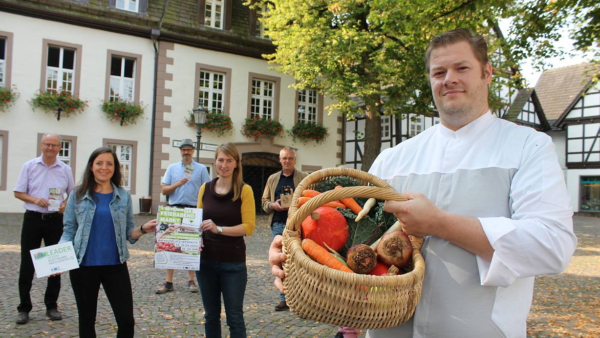Dominique Kirchhoff vom Restaurant "Heimatliebe" in Amelunxen (im Vordergrund) wird beim ersten Beverunger Feierabendmarkt Burger für die Besucher braten. Zum Organisationsteam gehören Vera Prenzel und Julia Knipping (Mitte v.l.). Auf die Premiere am 25. September freuen sich auch Hubertus Grimm (hinten v. l.), Sebastian Kübler und Hartmut Zenker. | © Manuela Puls