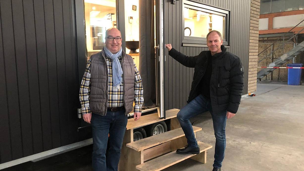 Hereinspaziert: Viele wollen das neue Tiny House von Kai Zimmermann (l.) und Thomas Menzel besichtigen. Das Ausstellungsstück steht in einer Beverunger Industriehalle. | © Manuela Puls