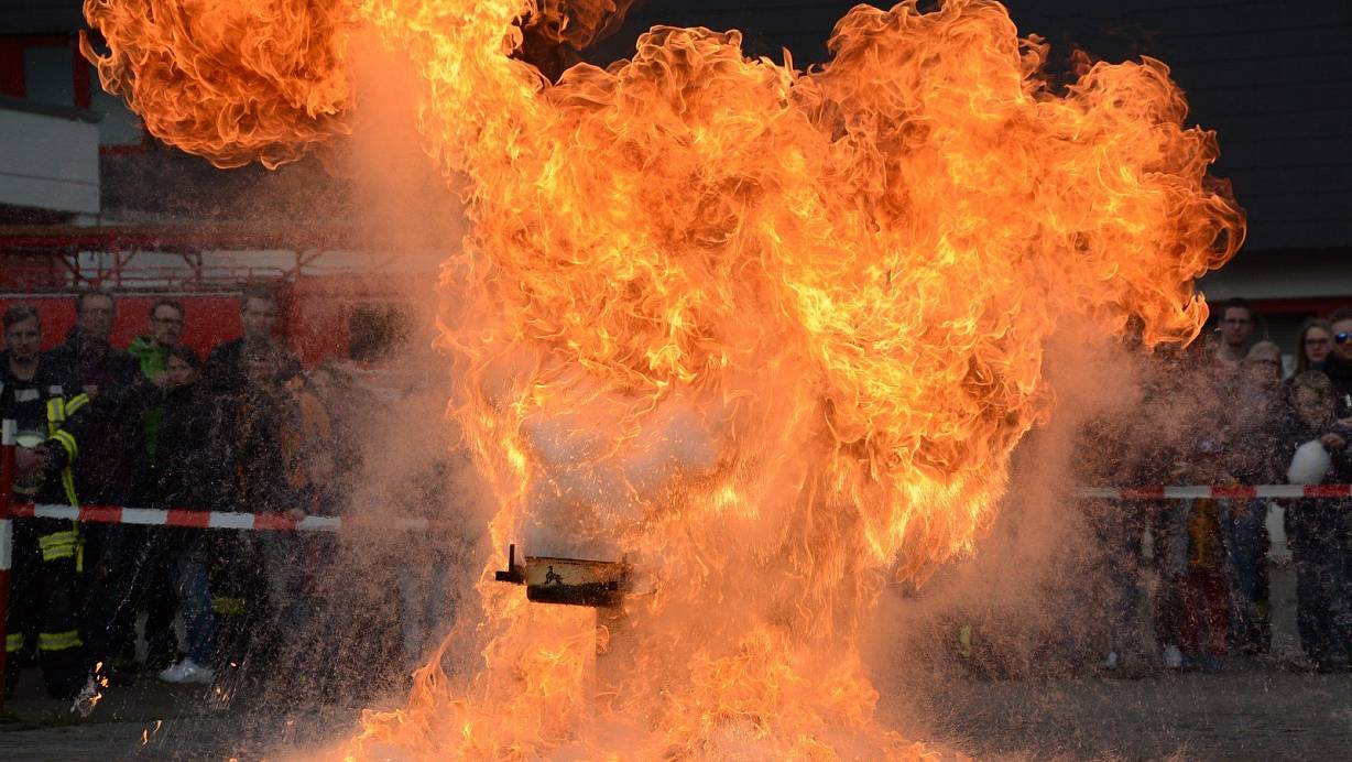 Bei einem Feuerwehrtag demonstriert die Feuerwehr Höxter die Gefahren eines Fettbrandes. | © Thomas Kube