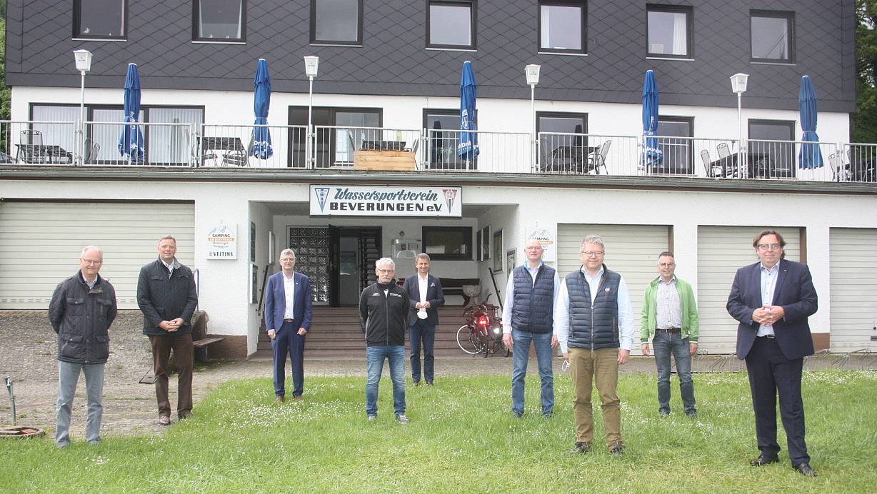 Begutachteten das Ergebnis der Arbeiten am Bootshaus: Hubertus Grimm (v. l.), Matthias Goeken, Christian Haase, Reiner Stuhldreyer, Michael Stickeln, Udo Katzenberger, David Lüdeke, Burkhard Dubberke und Ralf Göllner. | © Torsten Wegener