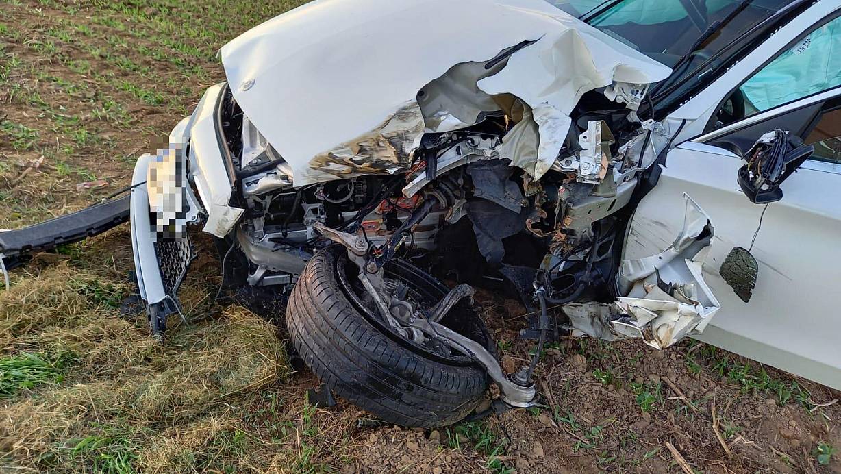 Der Mercedes schleudert nach dem Zusammenstoß auf der Kreisstraße 48 bei Beverungen aufs Feld und wurde schwer beschädigt. | © Torsten Wegener