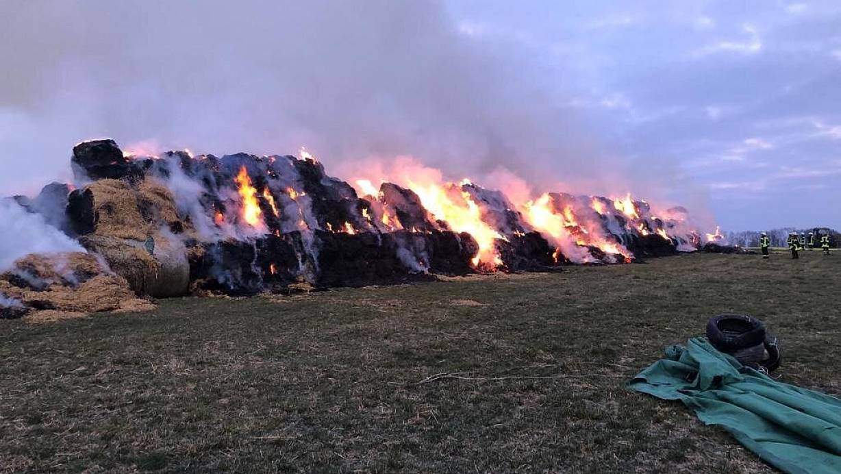 Eine große Strohmiete brennt in der Nacht zu Sonntag lichterloh. Einsatzkräfte rechnen mit tagelanger Brandwache.