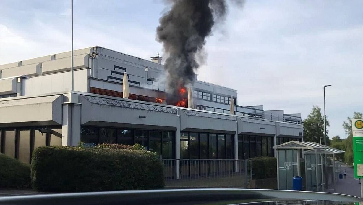 Eine schwarze Rauchsäule steigt vom Gymnasium Beverungen auf. Der Schaden am Gebäude ist groß. | © Tina Aydin