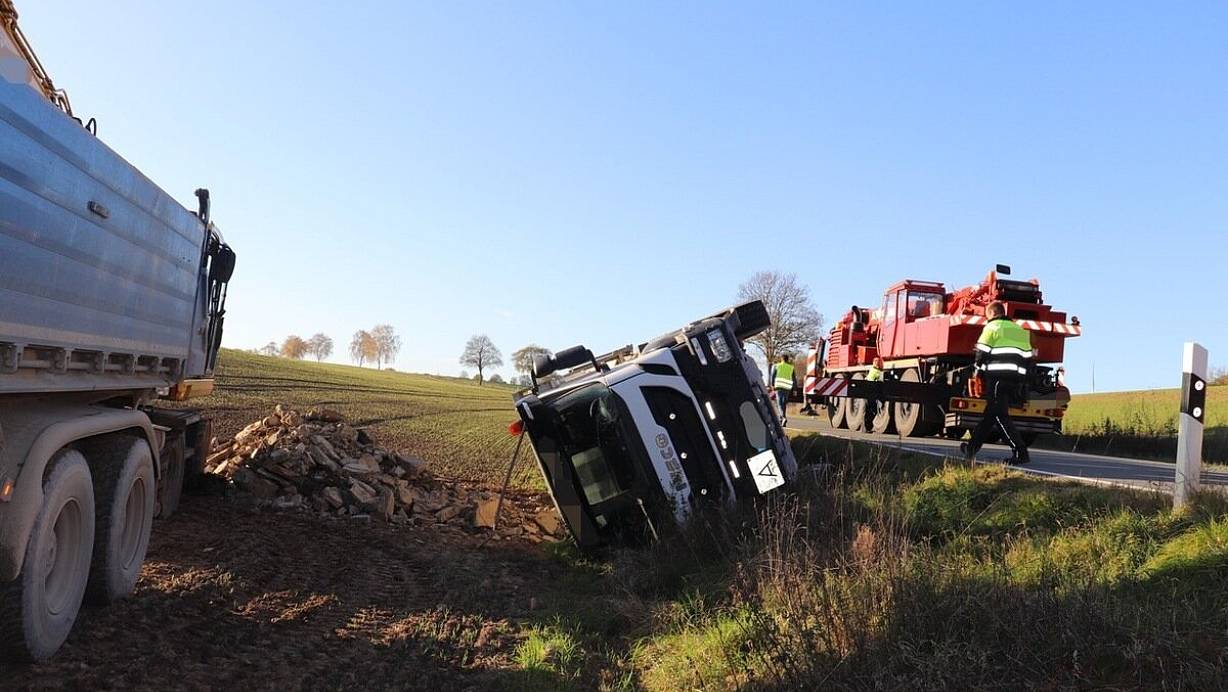 Der Unfall ereignete sich Polizeiangaben zufolge gegen 14.46 Uhr nahe eines Kurvenbereichs der K48 zwischen Beverungen und Drenke. Ein 55-jähriger Holzmindener fuhr mit seinem Kipper Richtung Beverungen. Als ihm ein mittig auf der Fahrbahn fahrender Lastwagen entgegenkam, musste er diesem ausweichen. Dabei kam der mit Steinen beladene Kipper auf den Grünstreifen, wo das Fahrzeug umkippte und auf einem Feld zum Liegen kam.