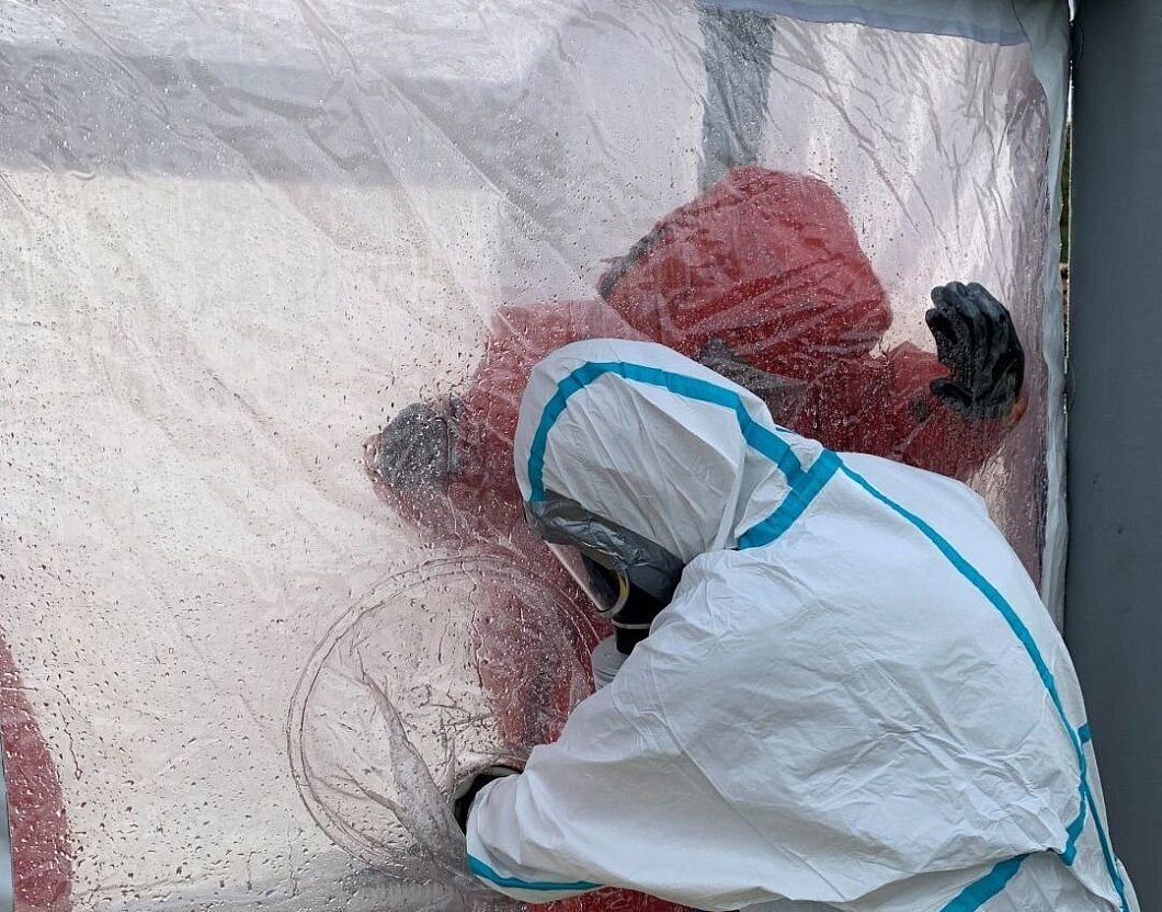 Mit Hilfe eines luftgestüzten Duschzeltes konnten alle am LKW eingesetzten Kräfte gründlich gereinigt werden, um eine Verschleppung des Gefahrstoffs zu verhindern. Bei einer gemeinsamen Nachbesprechung konnten alle eingesetzten Kräfte ein positives Fazit zur durchgeführten Übung und den gewonnenen Erkenntnissen ziehen