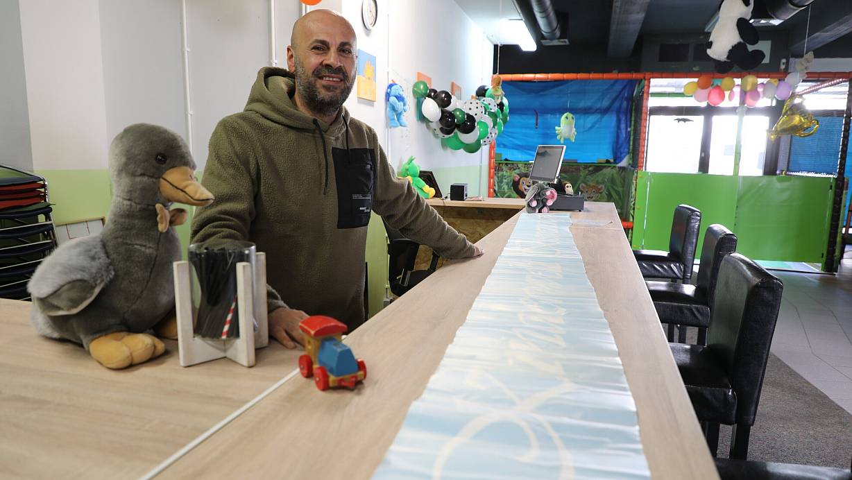 Halil Solugan mit dem Schriftzug von der „Kinderwelt Beverungen“, der noch draußen angebracht wird. | © Simone Flörke