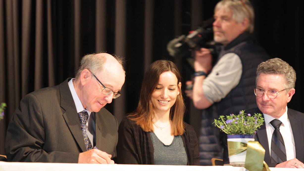 Geschichtslehrer Christoph Reichardt (v. l.), Birte Hewera und Schulleiter Benedikt Marpert unterzeichen die Kooperationsvereinbarung. | © Torsten Wegener