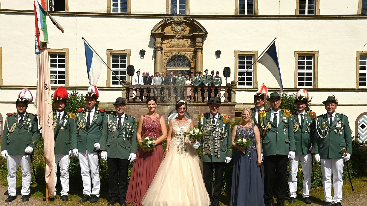 Die Majestäten Markus Ulber und Kerstin Scholle (vorn, Mitte) mit ihrem Hofstaat Lothar Scholle und Sarah Kronberg sowie Ludger Schröder und Nadine Schröder und den Ehrengästen vorm Schloss. | © Thomas Kube