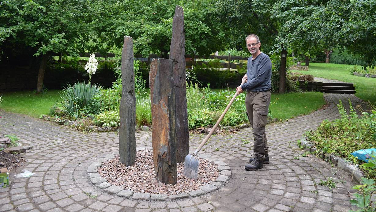 Der Amelunxer Ralf Meibom kümmert sich ehrenamtlich um den Lebensgarten und hat das Gelände rund um die drei neuen Stelen gestaltet. | © Nicole Fischer