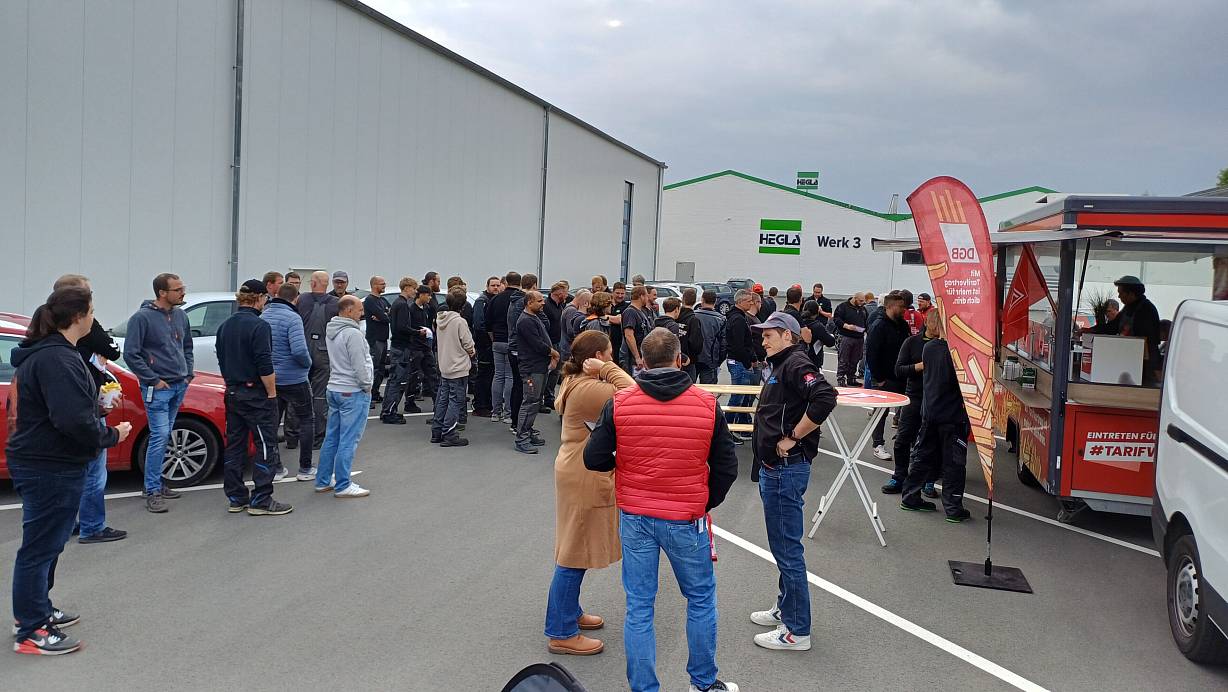 DGB und IG Metall informieren Beschäftigte bei Hegla über die Tarifverhandlungen im Schlosserhandwerk und bringen zudem das Frittenmobil mit. Warum der Standort in Beverungen „hoch relevant“ für die Gewerkschaften ist.