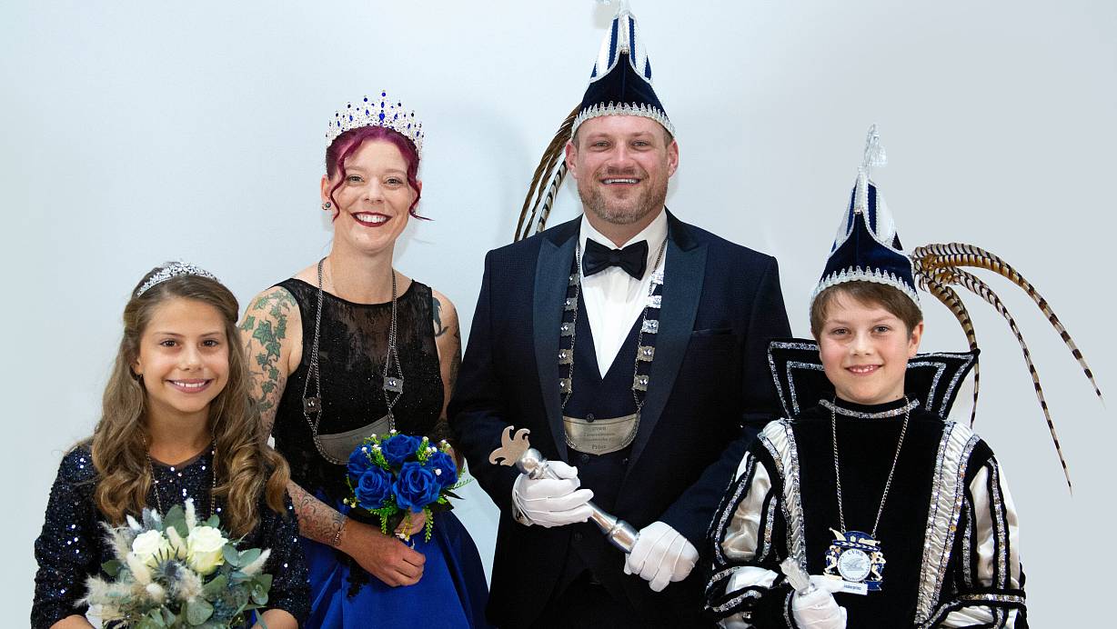 Carena Zarnitz und Florian Kastens (M.) aus Beverungen sind das Prinzenpaar in der 50. Session des Carnevalsverein Weserbrücke. Das Kinderprinzenpaar bilden Johanna Kleinschmidt und Till Marx aus Würgassen. | © CVWB