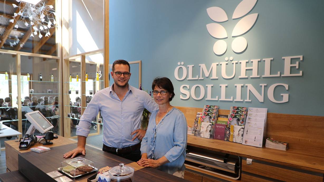 Erweiterte Öffnungszeiten: Sebastian Baensch und Annette Rose im Kassenbereich des Ladens mit dem Logo der Ölmühle Solling. | © Simone Flörke