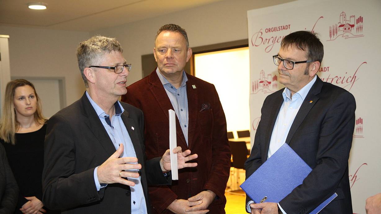 Dialog: Der Bundesabgeordnete Christian Haase (v. l.) und der Landtagsabgeordnete Matthias Goeken wollen erreichen, dass die Kommunen wieder mehr Rechtssicherheit bei der Planung von Windkraftanlagen haben. | © Hermann Ludwig