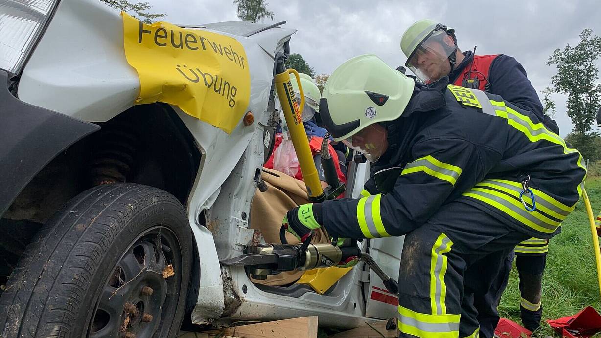 Bei einer Übung wird ein Dummy aus einem vermeintlich verunfallten Fahrzeug befreit. | © FW Borgentreich