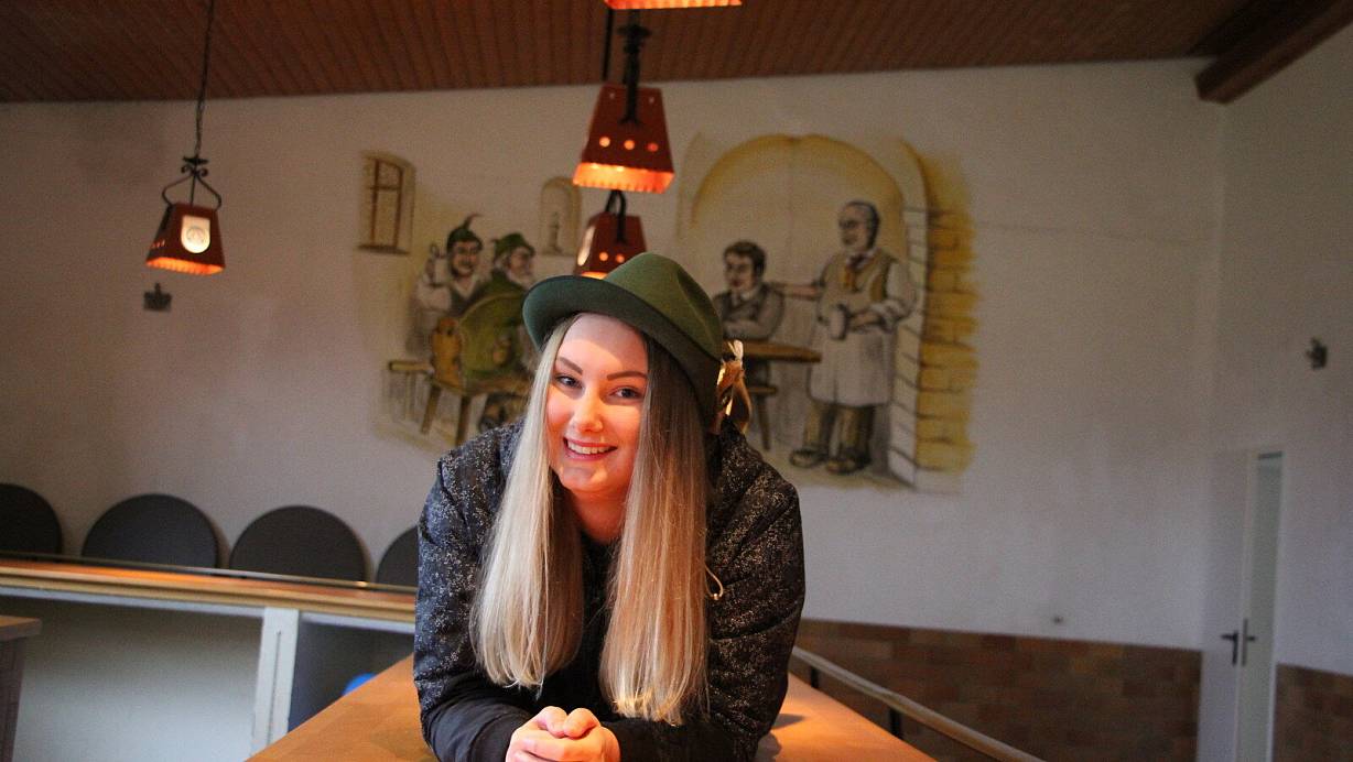 Pia Heise komplettiert in der Muddenhagener Bergwaldhalle das Wandbild der feiernden Männer.  | © Saskia Jochheim