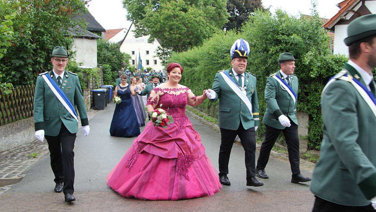 Mit fröhlichen Klängen hielt der Musikverein gegen das Wetter – und siehe da: Als ihre Majestäten unter freien Himmel traten, tröpfelte es nur noch leicht.