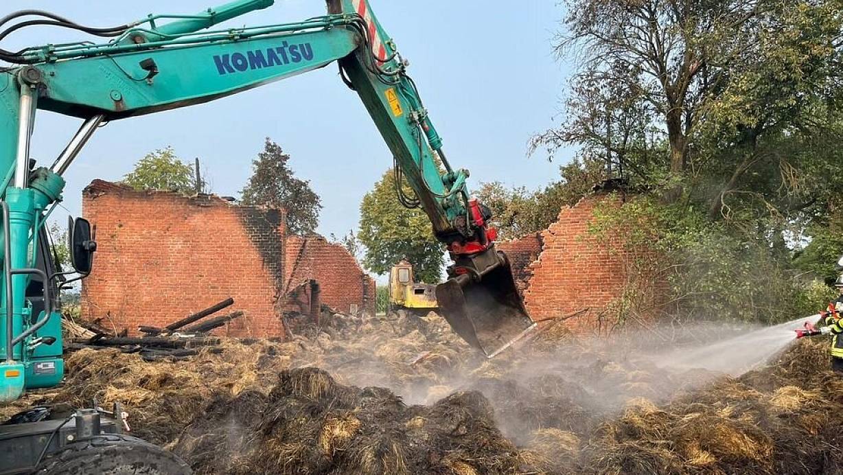 Ein Bagger zieht das Stroh auseinander: Am 28. August war im Borgentreicher Ortsteil Körbecke eine Feldscheune abgebrannt. Die Feuerwehr war noch Tage später mit Nachlöscharbeiten beschäftigt. Foto: Feuerwehr Borgentreich | © Feuerwehr Borgentreich