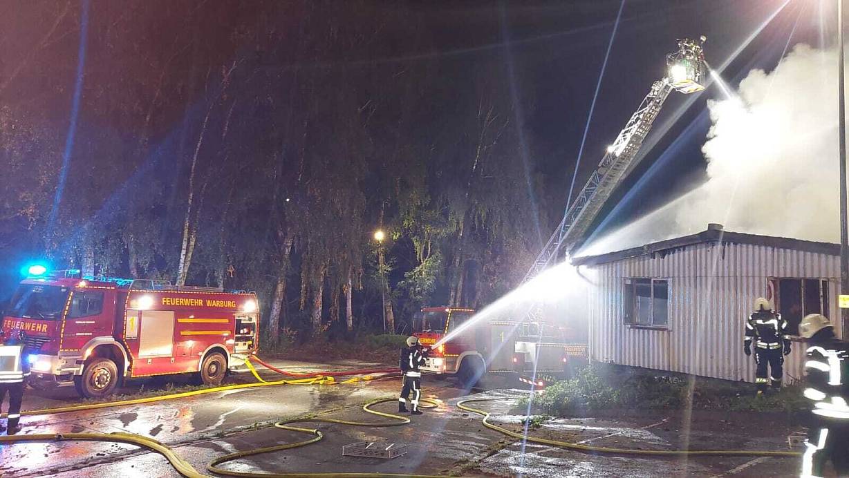 Auf dem Gelände der ZUE in Borgentreich löschen Einsatzkräfte in der Nacht zu Mittwoch das Dach einer leerstehenden Baracke. | © FFW Borgentreich