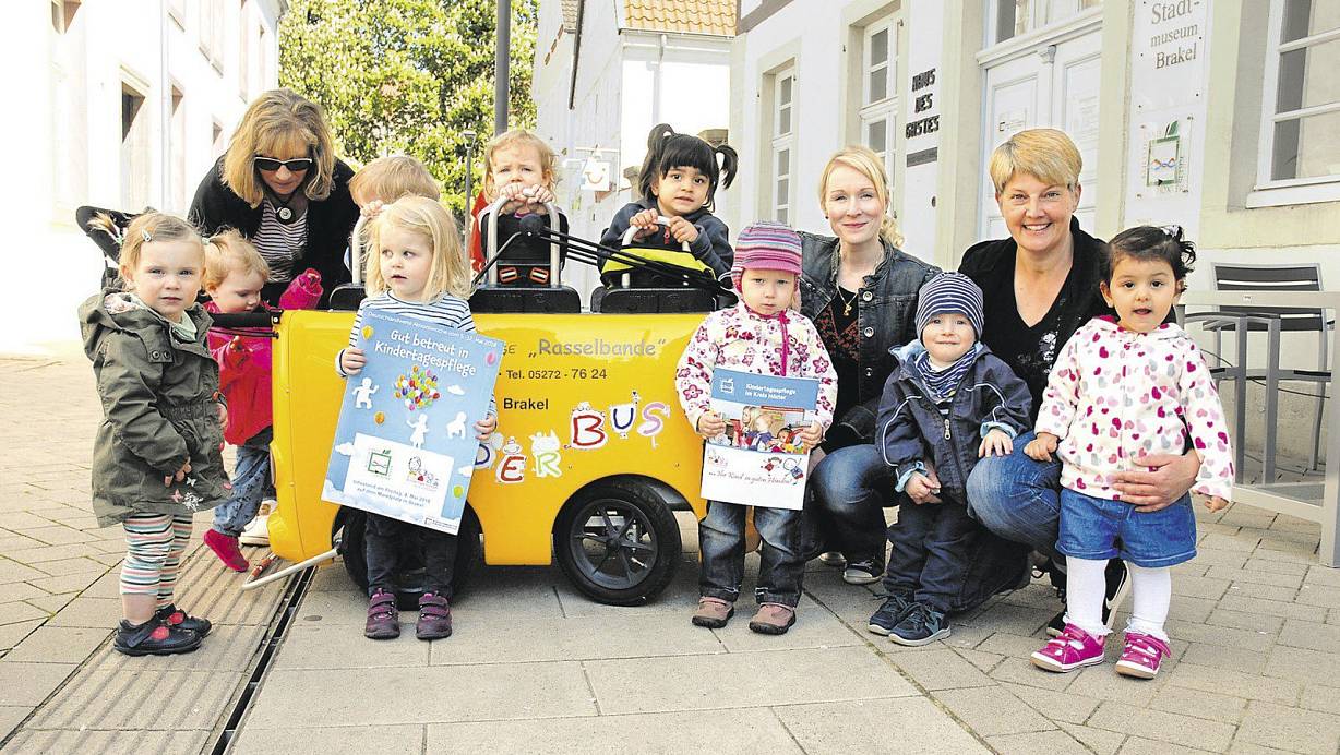 Kinderreich: Der Aktionstag auf dem Marktplatz in Brakel liefert Informationen rund um die Kindertagespflege. Mit dabei waren Leni (v. l.), Hanna, Birgit Lange, Arne, Rieke, Pia, Nehir, Sofia, Stephanie Werk-Ferber, Jón, Tanja Wegener und Beyzar. | © Mareike Gröneweg