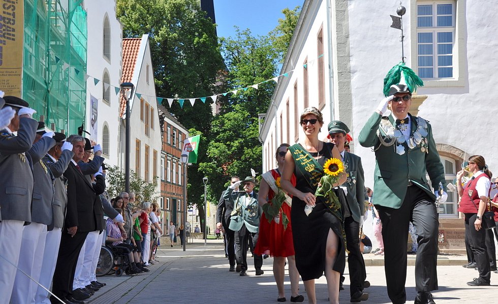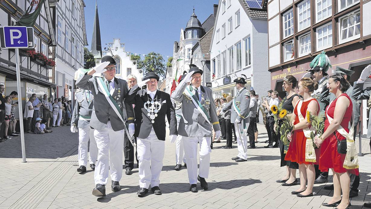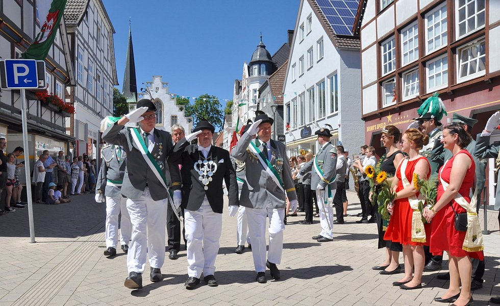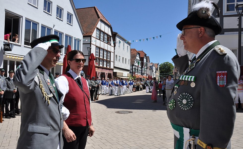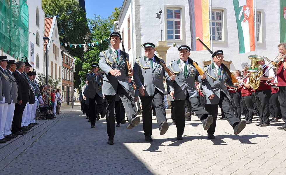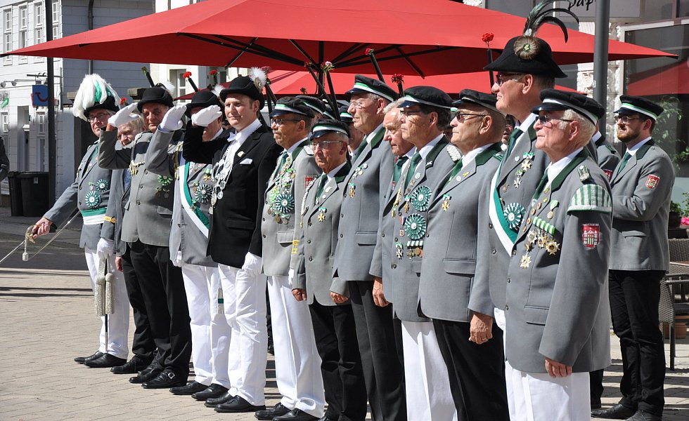 Am Samstagnachmittag waren alle Augen auf den neuen Schützenkönig Marc Jensen aus dem zweiten Zug gerichtet, der hier erstmals die Parade der Schützen abnahm. Diese präsentierten zu Ehren seiner Majestät ihre mit Blumen verzierten Holzgewehre während Fähnrich Hans-Jörg Koch die Vereinsfahne schwang. Unter den Klängen der Musikkapellen und Spielmannszüge und flankiert von seinen Dechanten Rudolf Beine und Helmut Pless schritt Jensen die Reihen der Schützen ab. Dabei wurden sie von Oberst Karl-Heinz Neu, Adjutant Alexander Tölle und Bürgermeister Hermann Temme begleitet.