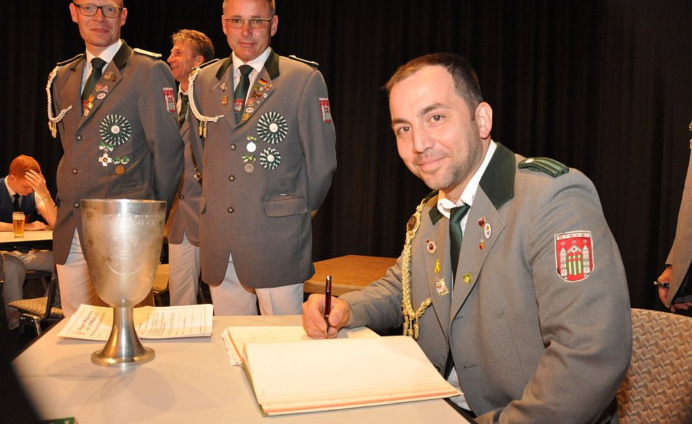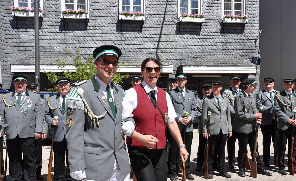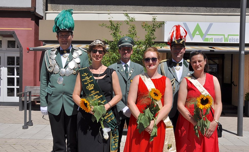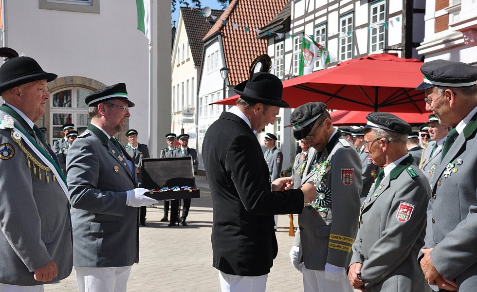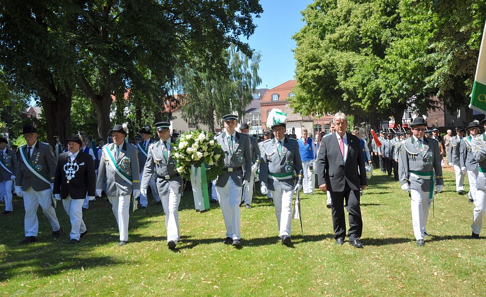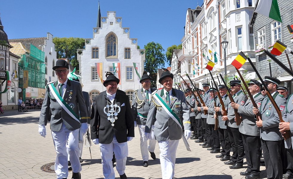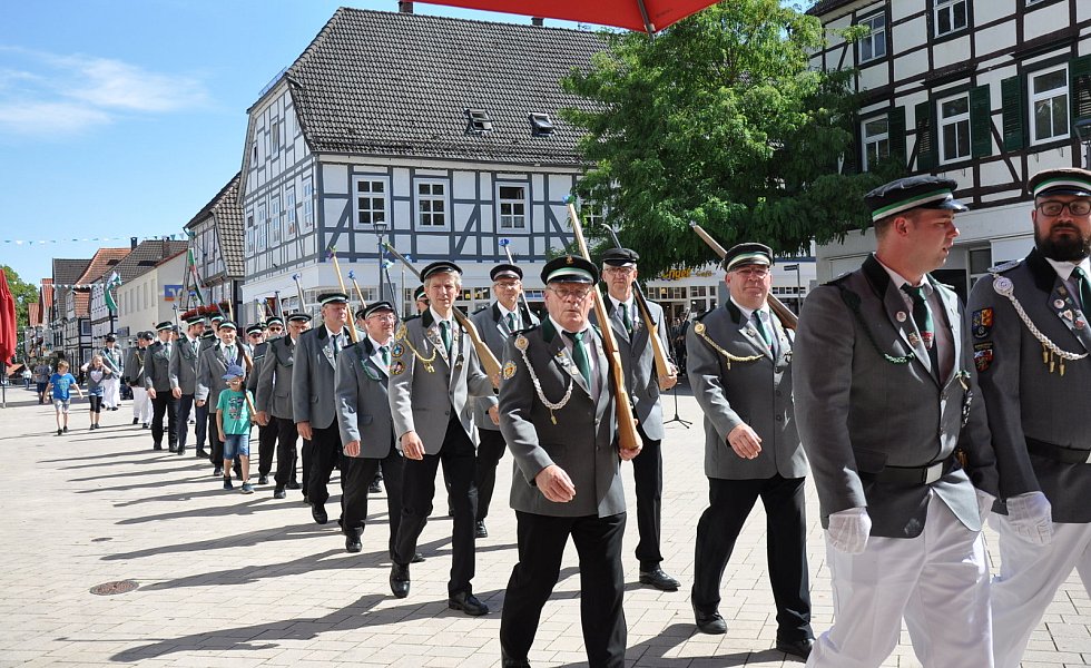 Am Samstagnachmittag waren alle Augen auf den neuen Schützenkönig Marc Jensen aus dem zweiten Zug gerichtet, der hier erstmals die Parade der Schützen abnahm. Diese präsentierten zu Ehren seiner Majestät ihre mit Blumen verzierten Holzgewehre während Fähnrich Hans-Jörg Koch die Vereinsfahne schwang. Unter den Klängen der Musikkapellen und Spielmannszüge und flankiert von seinen Dechanten Rudolf Beine und Helmut Pless schritt Jensen die Reihen der Schützen ab. Dabei wurden sie von Oberst Karl-Heinz Neu, Adjutant Alexander Tölle und Bürgermeister Hermann Temme begleitet.