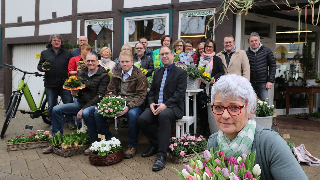 Frühling begrüßen: Das Foto zeigt Vertreter der Teilnehmer vor dem Blumenhaus Wecker am Markt in Brakel mit Doris Schünemann (vorn). | © Simone Flörke