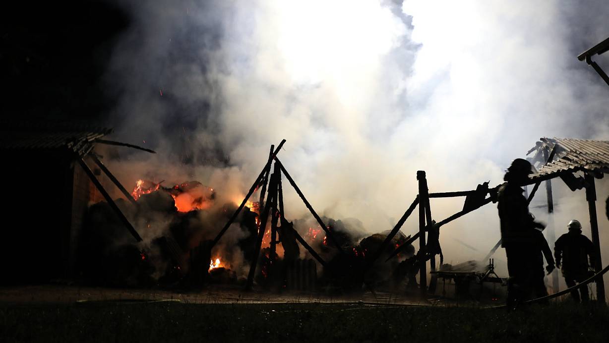 Mit 16 Fahrzeugen rücken die Einsatzkräfte in der Nacht zu Mittwoch zu einem Feuer auf einem landwirtschaftlichen Hof aus. Dort brennt eine Scheune mit Rundballen und Holz