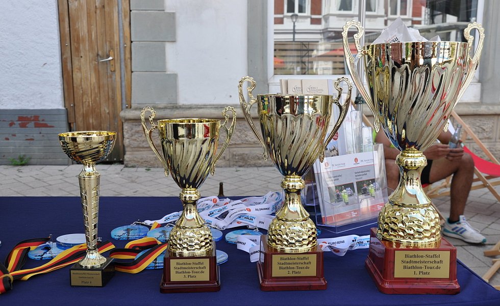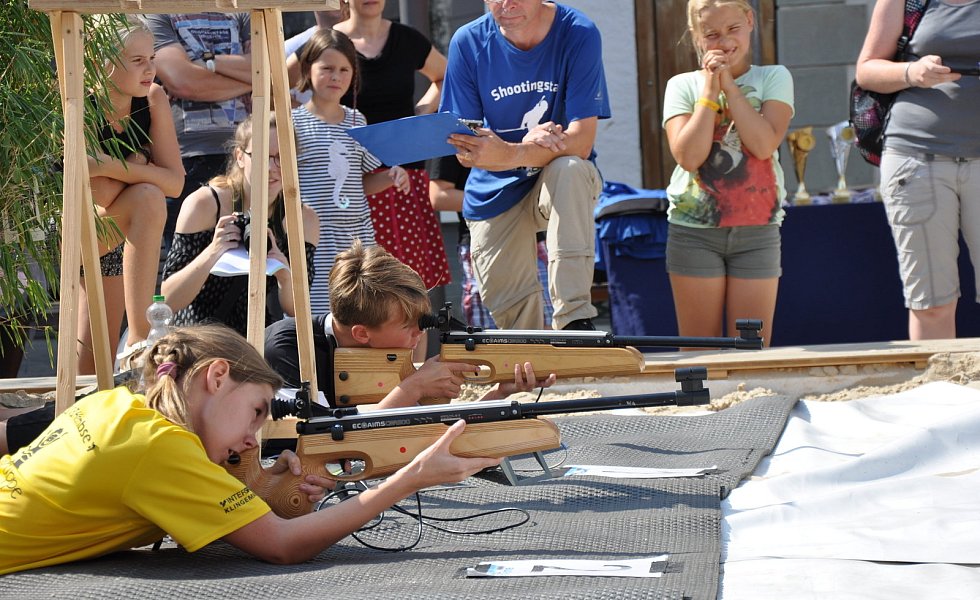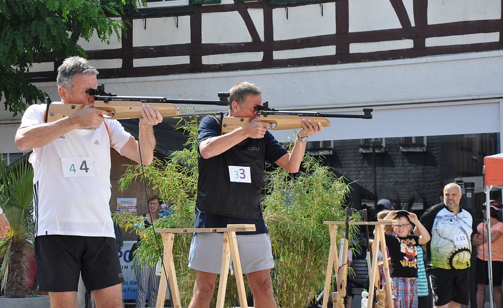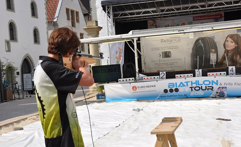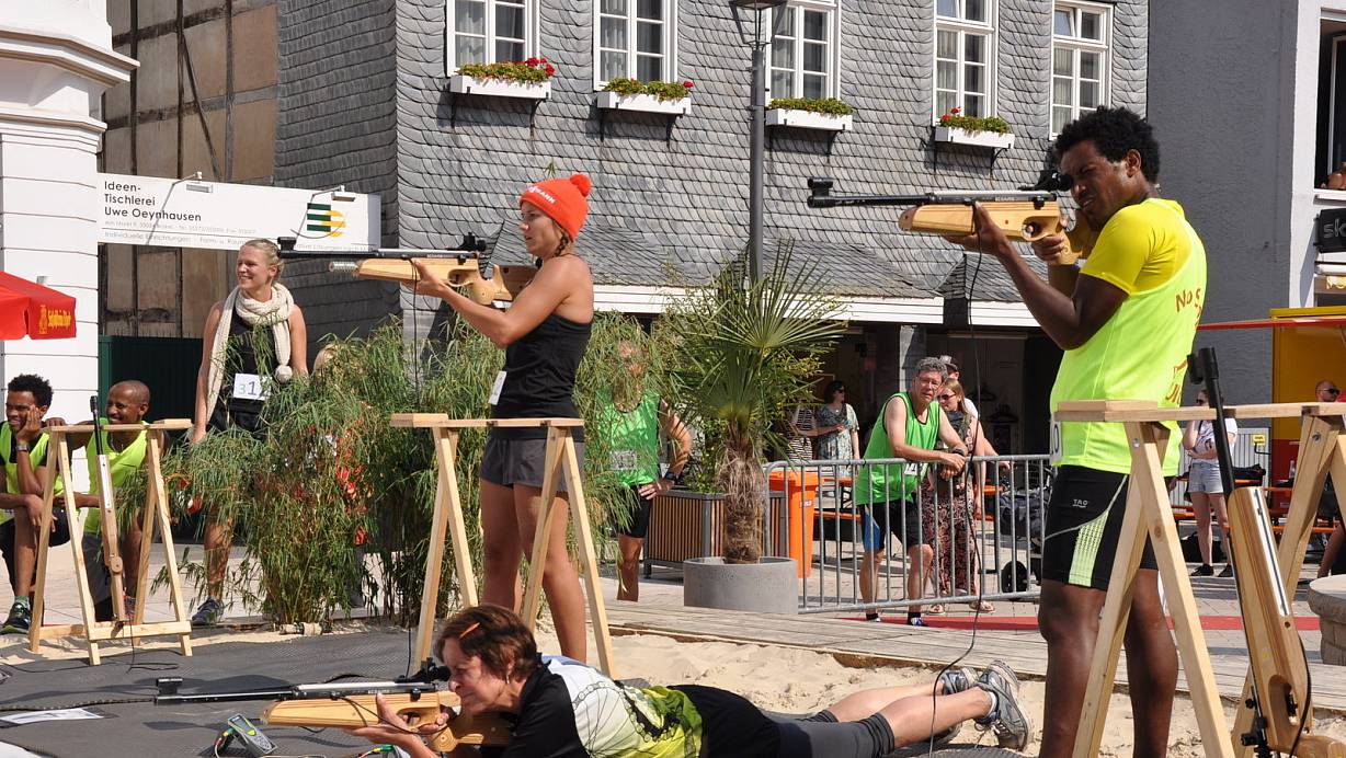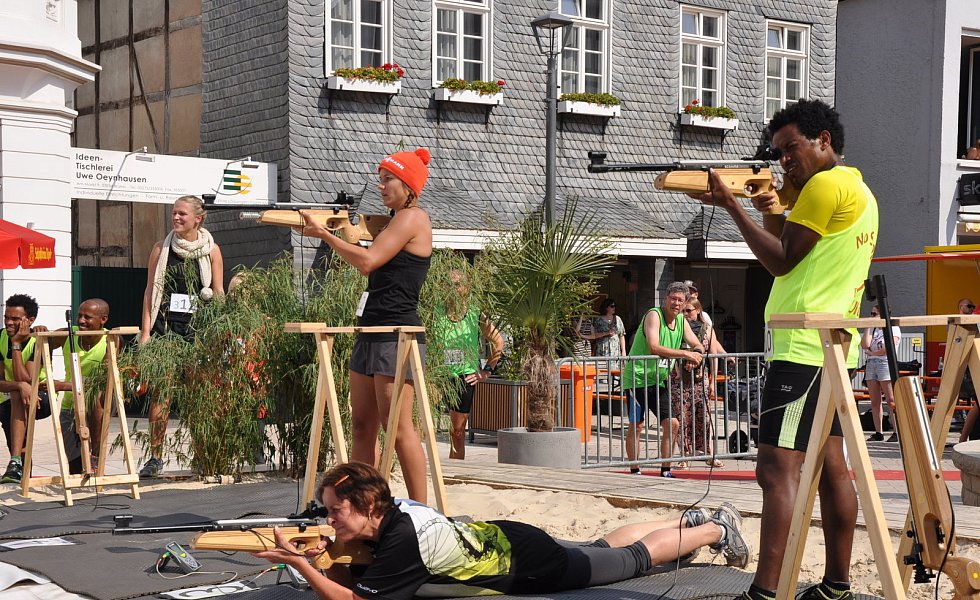 Mit auf Lasern umgerüsteten Biathlongewehren galt es, liegend mit fünf Schuss aus zehn Meter Entfernung auf 45 Millimeter Ziele zu treffen. Wer daneben gepeilt hatte, musste bei jedem Fehlschuss eine 50-Meter-Strafrunde absolvieren. Dann ging es in den zweiten Laufabschnitt mit Schießen im Stehen. Nach einer Schlussrunde von 200 Metern erfolgte die Übergabe an den Staffelkollegen. Bei Temperaturen um die 30 Grad war der City-Biathlon allerdings eine schweißtreibende Angelegenheit und Herausforderung zugleich.