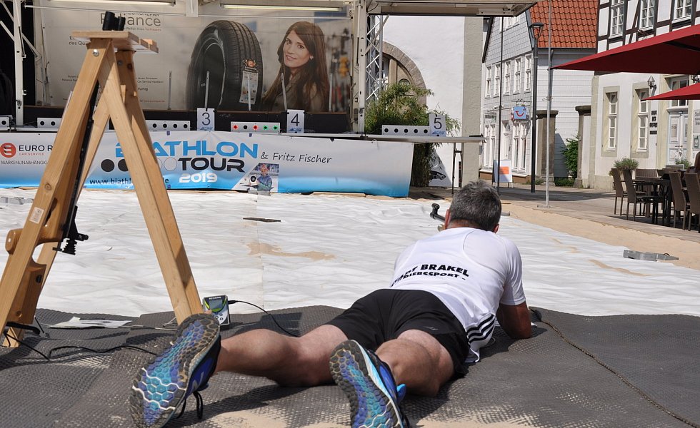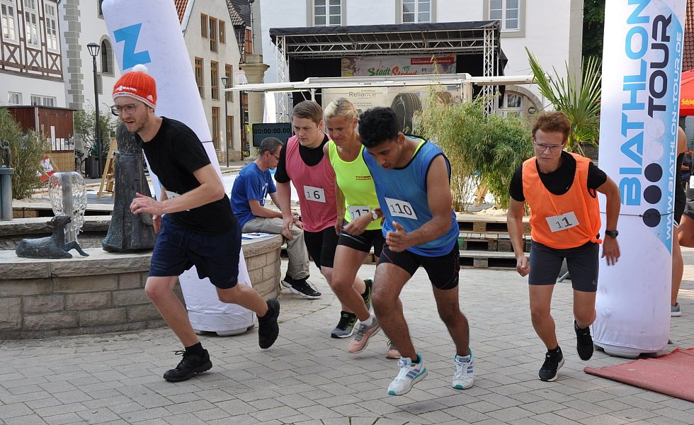 Brakel. Es war schon ein besonderes Sportspektakel, das die vielen Zuschauer auf dem Marktplatz erlebten. Brakels gute Stube hatte sich in eine brodelnde Biathlon-Arena verwandelt. 18 Erwachsenen- und zwei Kinder-Teams vom TuS Hembsen (Laufgruppe) gingen beim ersten City-Biathlon an den Start. Vereine, Unternehmen und Freundesgruppen hatten sich zu Viererteams zusammengeschlossen, um Ausdauer, Präzession und Teamgeist zu zeigen.