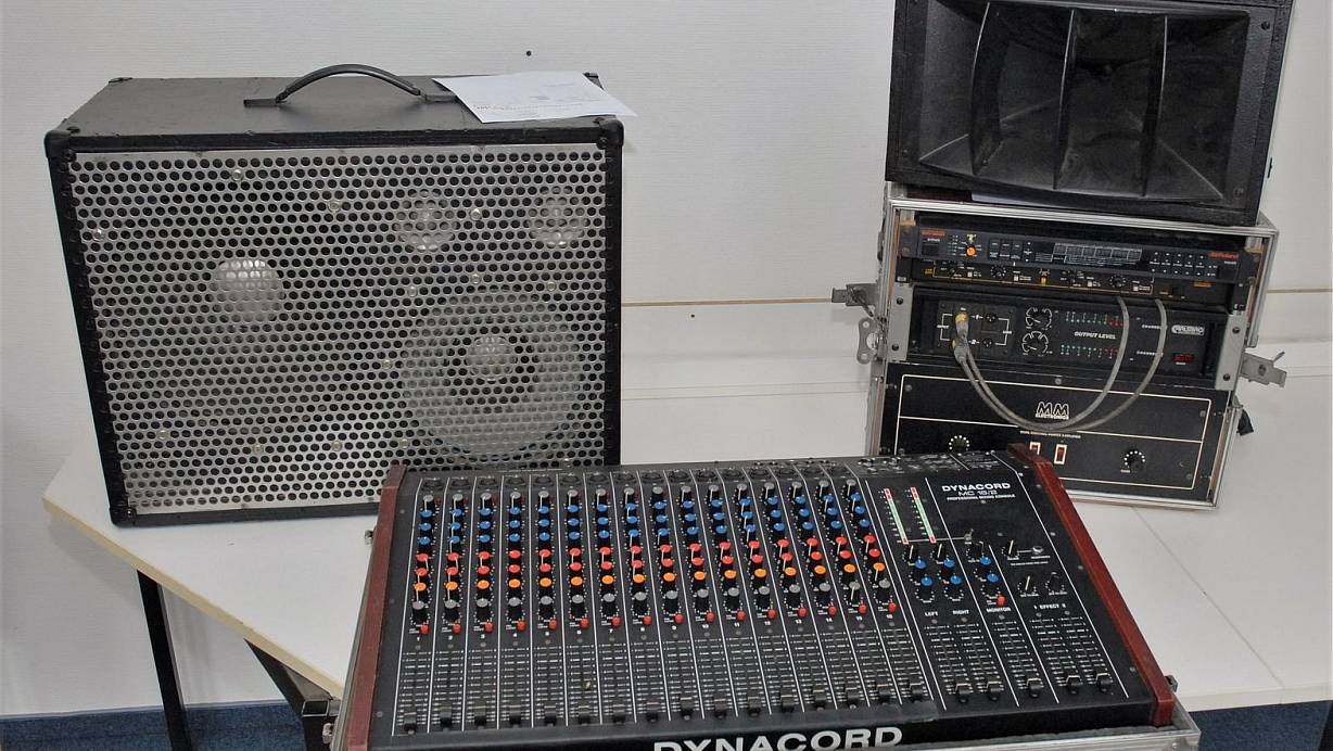 Bei der Musikanlage handelt es sich um Bühnen-Equipment, wie es in der Regel kleine Live-Bands benutzen. Darunter ein 16-Kanal-Mischpult der Marke Dynacord, ein 19-Zoll-Case mit eingebauter Endstufe und Effektgeräten sowie insgesamt vier Lautsprecher, die nach Eigenbauten aussehen. Ob die Geräte, die augenscheinlich mehrere Jahre alt sind, noch funktionstüchtig sind, ist unklar.