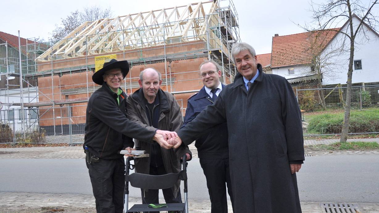 Jetzt wurde das Richtfest der 13,2 Meter langen und 11,25 Meter breiten Fahrzeughalle gefeiert. Sie schließt an das bestehende Feuerwehrhaus an und bietet nun genügend Platz für die beiden Großfahrzeuge. Mit dem vier Meter hohen Tor ist auch die Durchfahrtshöhe zukunftsfähig bemessen. Die Fenster sollen bis Weihnachten eingesetzt sein.