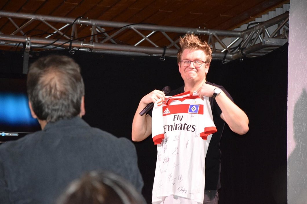Zum Abschluss seines Auftritts gab es schließlich minutenlange Standing Ovations für den Künstler. Als Dankeschön für seinen kostenlosen Auftritt erhielt Thorsten Bär ein signiertes Trikot des HSV und eine Videobotschaft des Hamburger Kapitäns Aaron Hunt. Sichtlich gerührt nahm der große HSV-Fan das Trikot mit den Worten: „Das ist mit Geld nicht zu bezahlen; es wird einen Ehrenplatz bei mir zu Hause bekommen" entgegen.