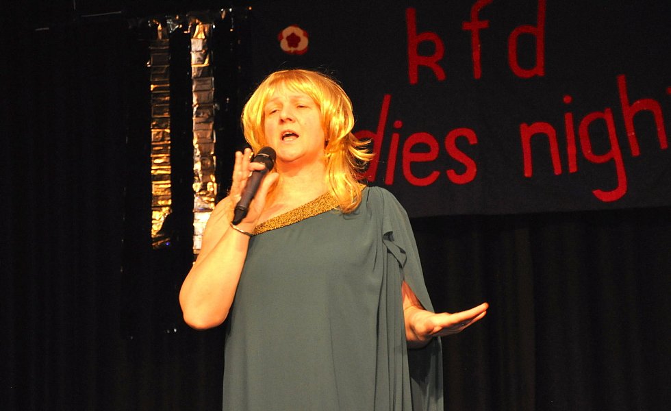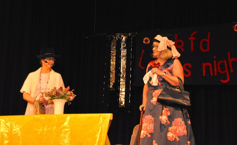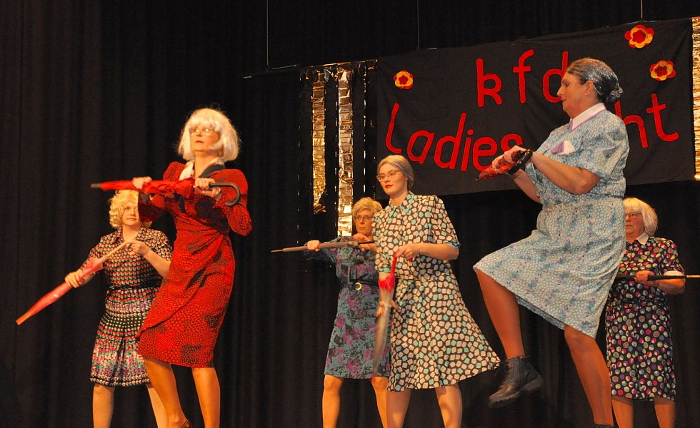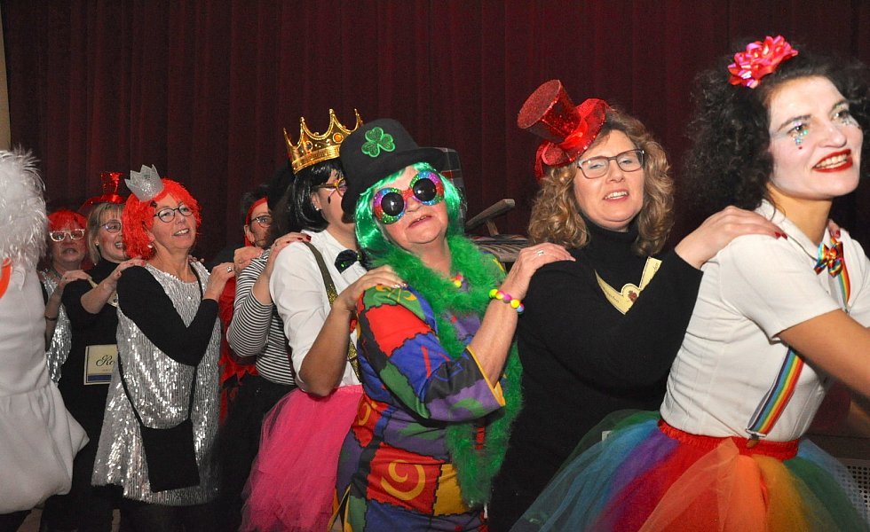 Der Startschuss in den jecken Abend voller guter Laune fiel mit dem stimmungsvollen Einzug der kfd-Akteurinnen. „Kirchen-Uhu“ Yvonne Engemann führte nicht nur die illustre Truppe an, sondern auch durch das tolle Programm. Da plauderten Gabi Römer-Reitemeyer und Claudia Fähnrich als „Waltraud und Mariechen“ über das Leben, Fashion, Schönheit und Ehemänner, riss Mechthild Wiegand als Sängerin „Beatrice Egli“ die jecken Frauen im wahrsten Sinne des Wortes von den Stühlen. Sie stürmten zur Bühne, tanzten zum Rhythmus der Musik und stimmten gemeinsam den Song „Mein Herz es brennt “ an.