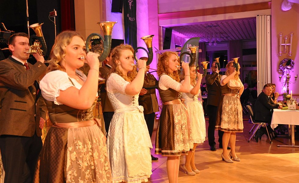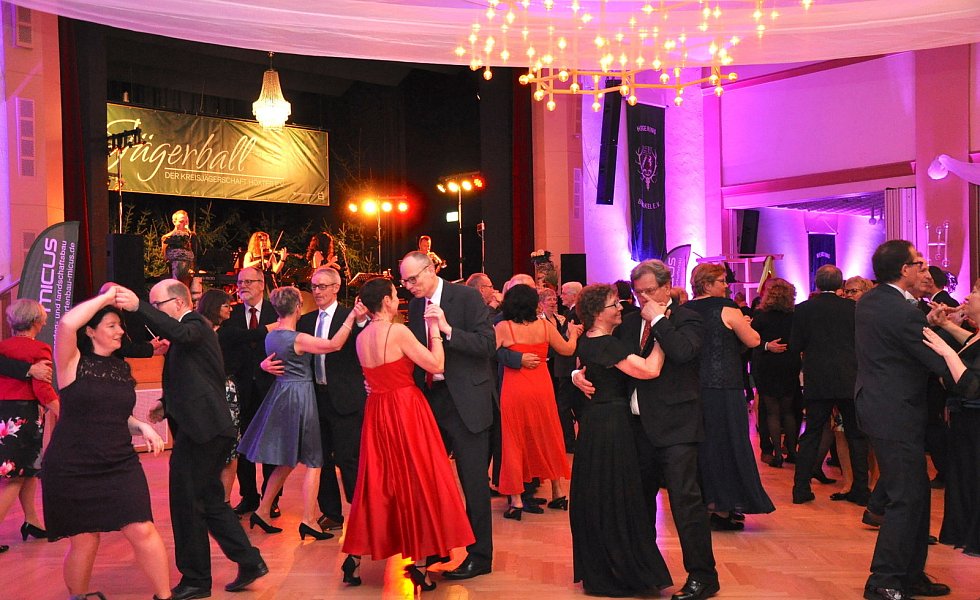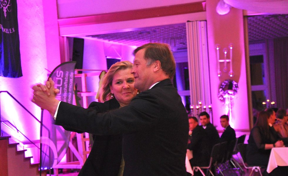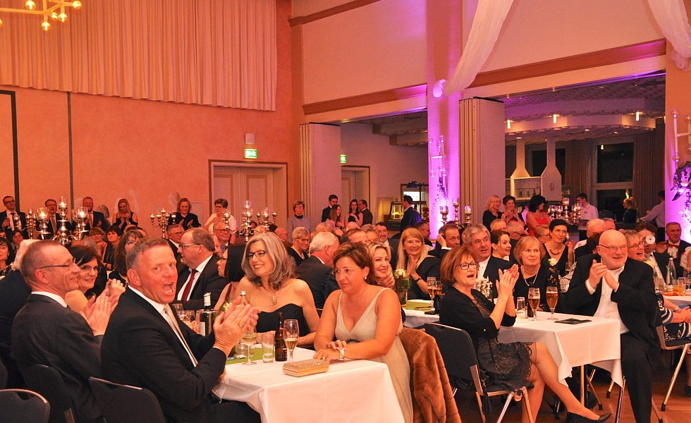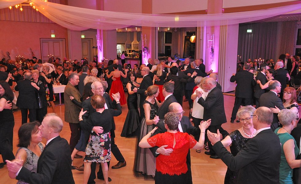 Zu ihrer Freude ließ sich Moderator Winkler auf einen Kurzauftritt mit den Rollschuh-Artisten ein. Auf ihren Unterarmen liegend, drehte er mit ihnen schwungvolle Runden und machte dabei eine gute Figur. Aber auch die Ballgäste gaben auf dem Tanzparkett durchweg eine gute Figur ab und ließen sich von den Klängen der Showband „Party Symphonie Orchester" inspirieren.